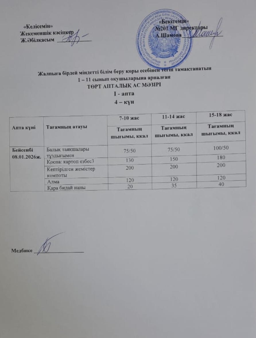 08 январь 2026 0 1 2 3 4 5 Жалпыға бірдей міндетті білім беру қоры есебінен тегін тамақтанатын 1-11 сынып оқушыларына арналған ас мәзірі