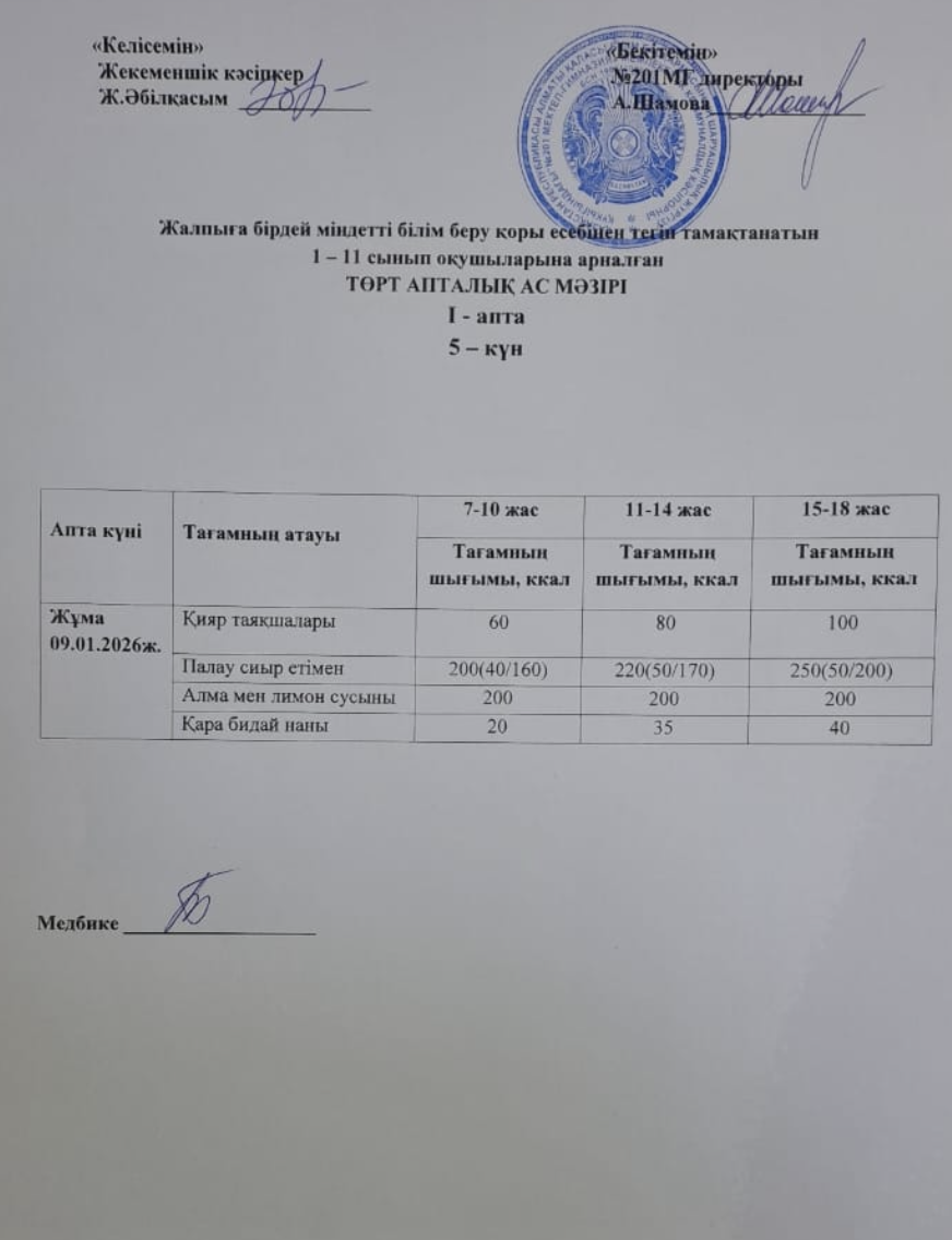 09 январь 2026 0 1 2 3 4 5 Жалпыға бірдей міндетті білім беру қоры есебінен тегін тамақтанатын 1-11 сынып оқушыларына арналған ас мәзірі