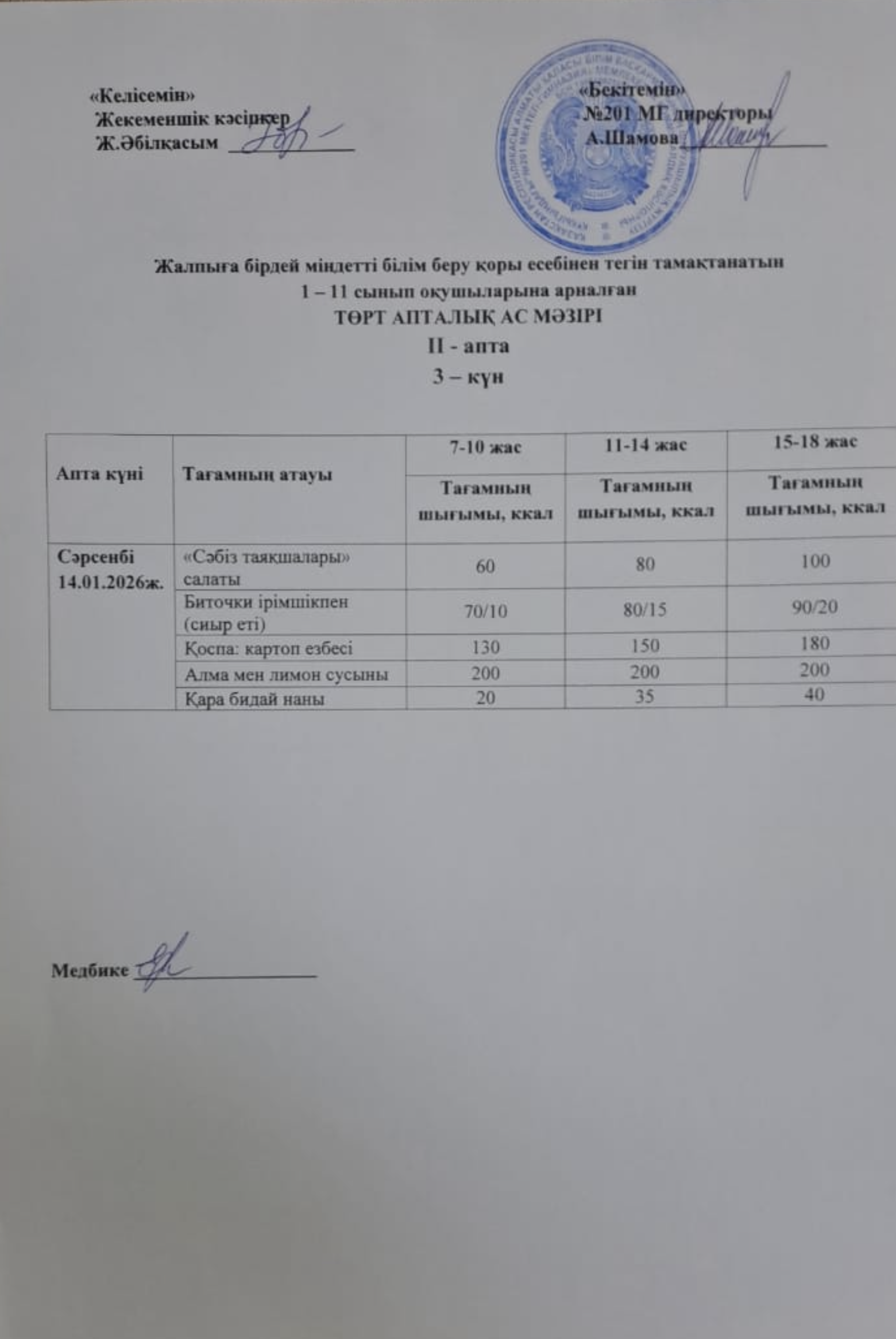 14 январь 2026 0 1 2 3 4 5 Жалпыға бірдей міндетті білім беру қоры есебінен тегін тамақтанатын 1-11 сынып оқушыларына арналған ас мәзірі