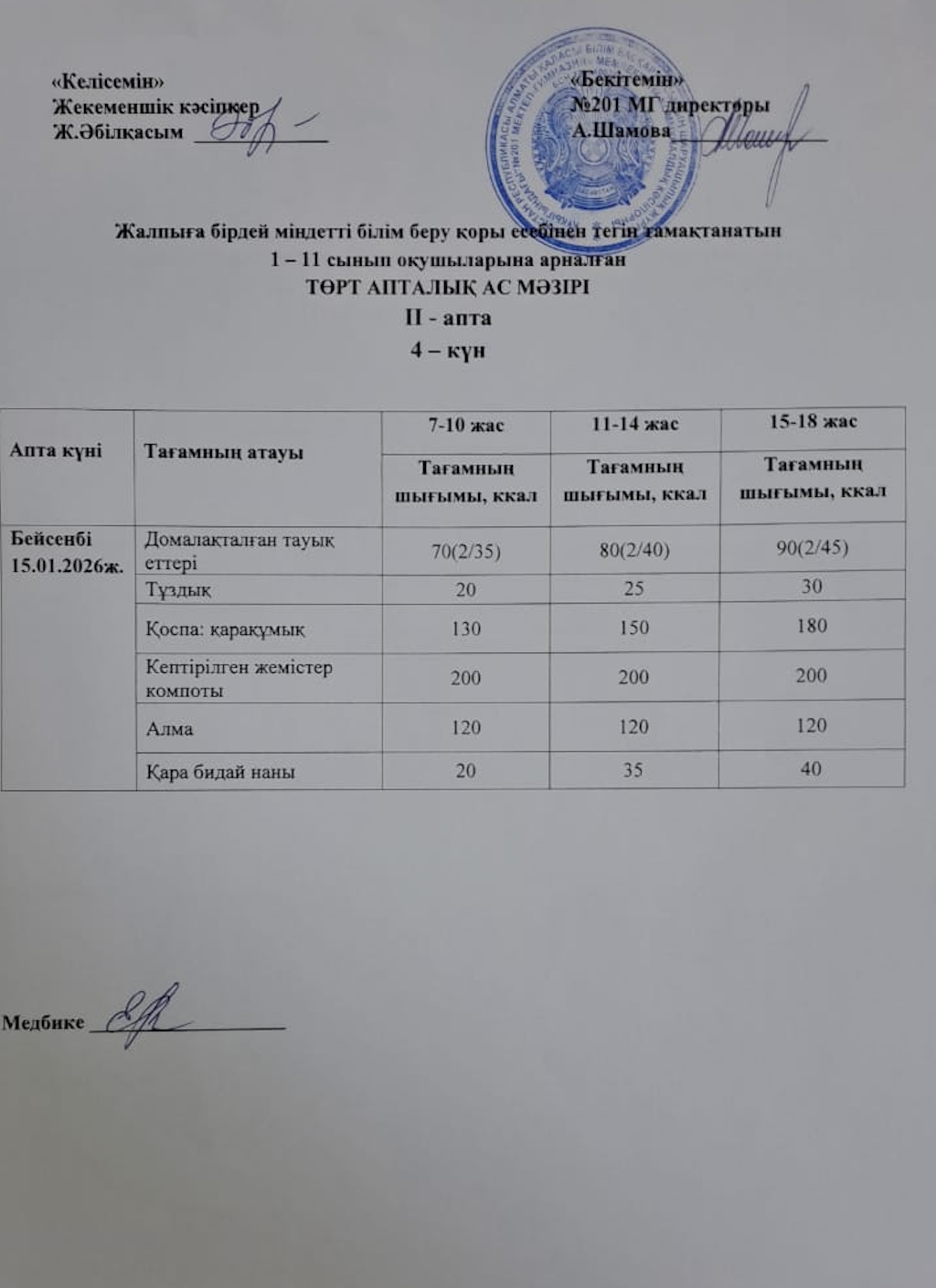 15 январь 2026 0 1 2 3 4 5 Жалпыға бірдей міндетті білім беру қоры есебінен тегін тамақтанатын 1-11 сынып оқушыларына арналған ас мәзірі