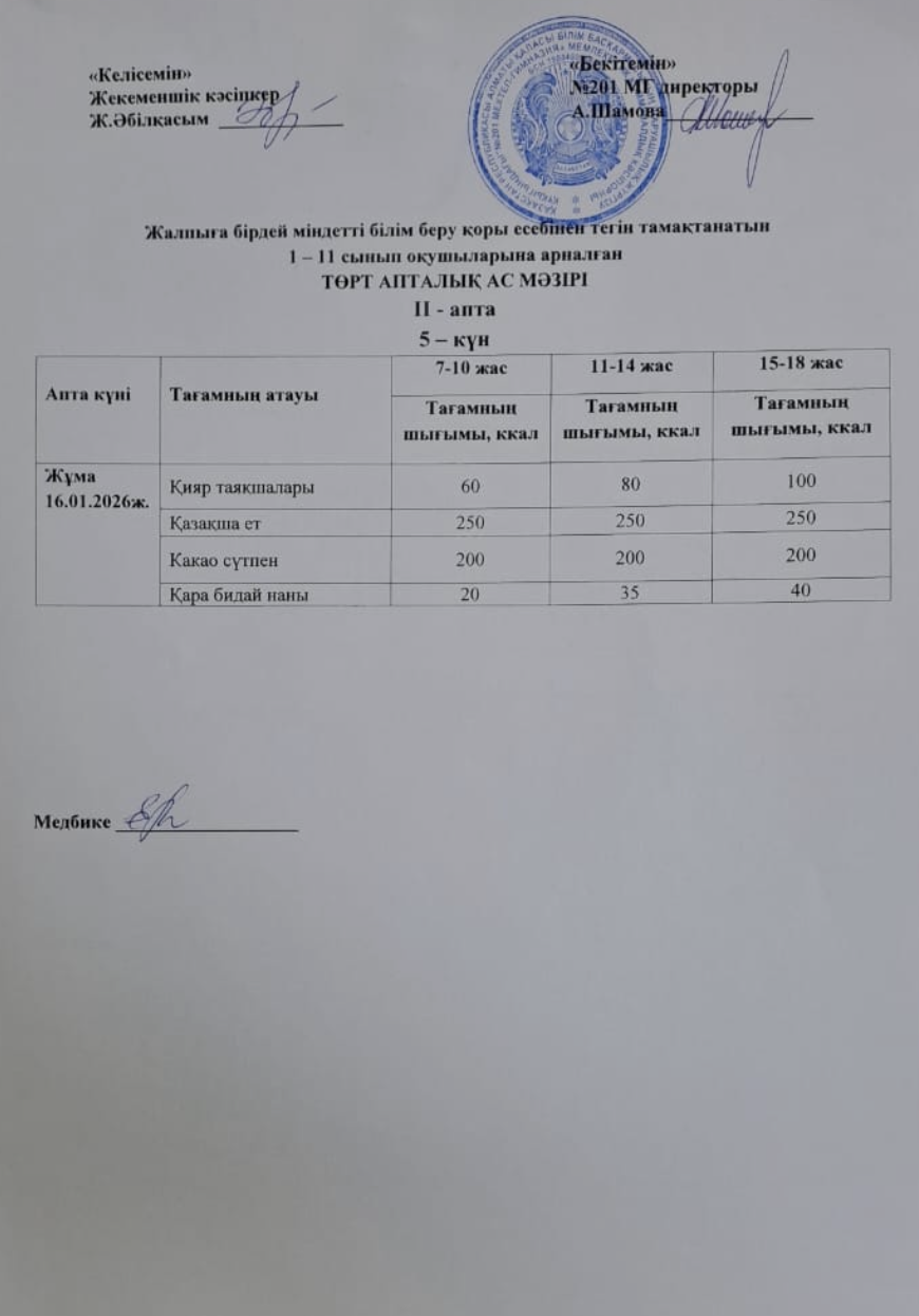 16 январь 2026 0 1 2 3 4 5 Жалпыға бірдей міндетті білім беру қоры есебінен тегін тамақтанатын 1-11 сынып оқушыларына арналған ас мәзірі