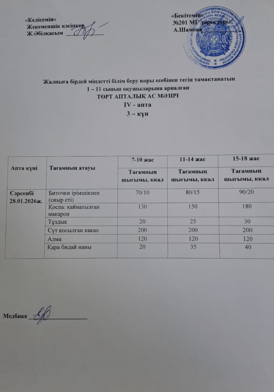 28 январь 2026 0 1 2 3 4 5 Жалпыға бірдей міндетті білім беру қоры есебінен тегін тамақтанатын 1-11 сынып оқушыларына арналған ас мәзірі