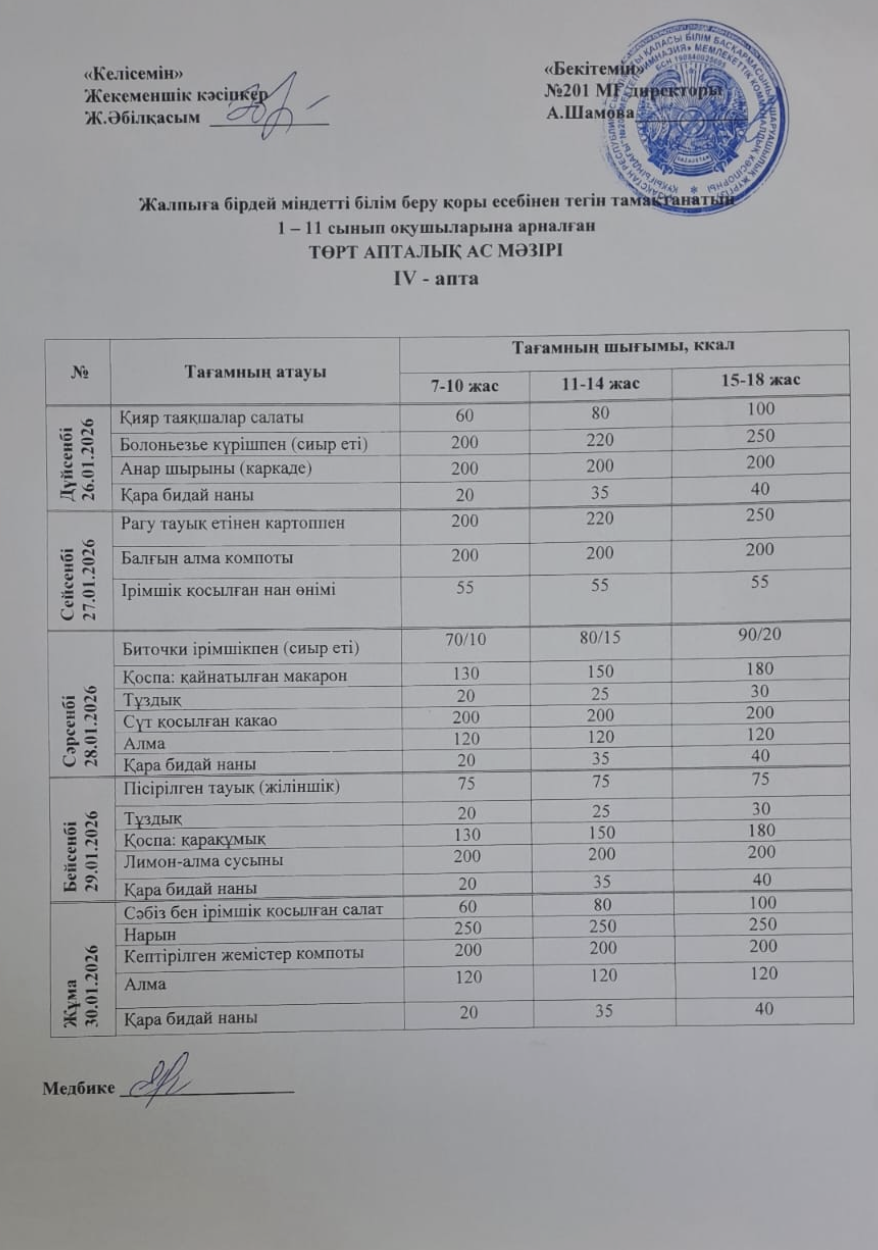 30 январь 2026 0 1 2 3 4 5 Жалпыға бірдей міндетті білім беру қоры есебінен тегін тамақтанатын 1-11 сынып оқушыларына арналған ас мәзірі
